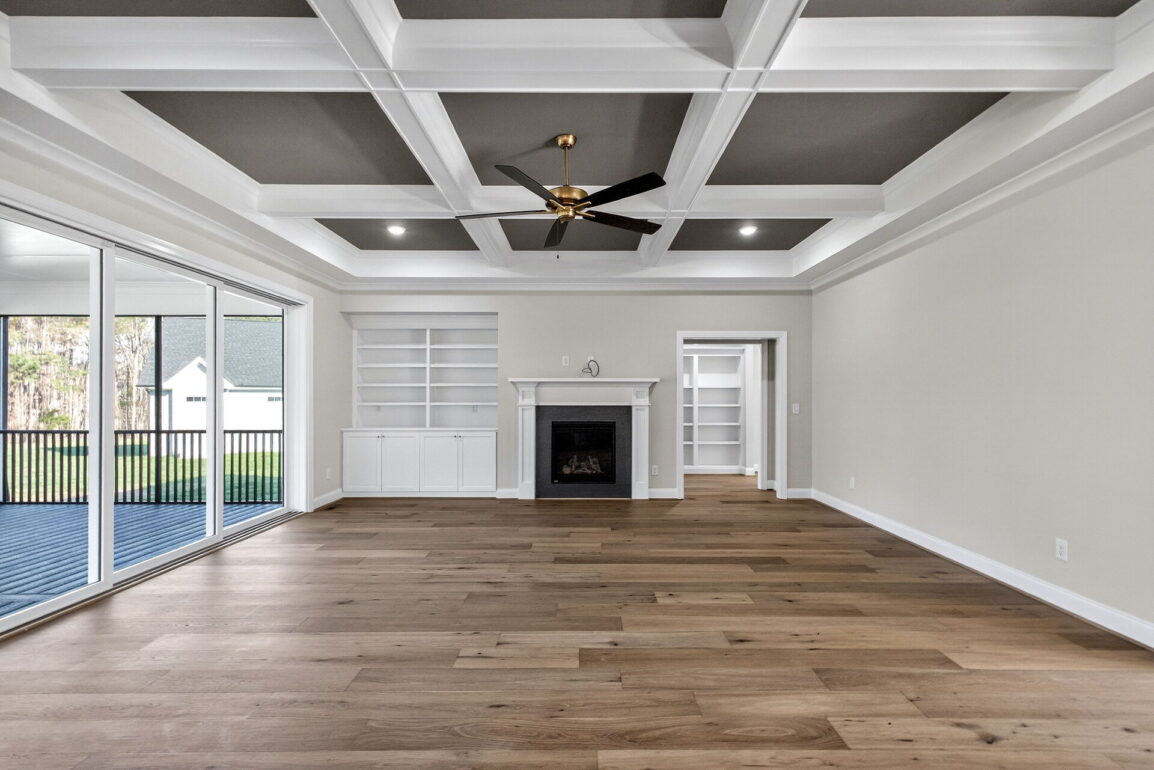 Step into the heart of this stunning, move-in ready home at 85 Old Garden Lane in Youngsville’s Tarborough Ridge—where comfort meets craftsmanship. This beautifully designed family room is made for everyday living and unforgettable gatherings. From the elegant coffered ceiling and cozy gas fireplace to the custom built-ins and natural light pouring in from expansive sliding doors, every detail invites you to relax and stay awhile.